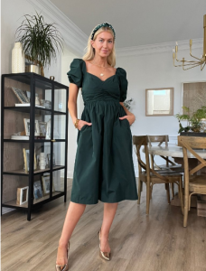 Deep emerald taffeta-like matte dress with pockets. I love that this one has a matte finish to it, so it’s not super shimmery. Cute bow in the back. The sleeves have a rubber stay in them too to keep them in place. Runs very small. Order 1-2 sizes up.