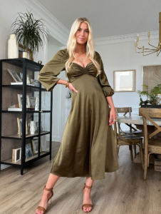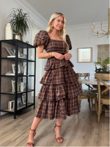 Brown plaid dress. This is the dress I wore for family pictures. It’s brown with cognac throughout. Almost a silk feeling fabric that falls really nicely. You can tie the velvet belt around the front or the back. So beautiful and fun to wear. Runs tts. Wearing a 0.