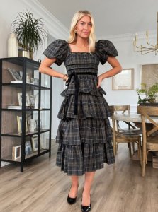 Plaid ruffle dress. This is the same dress I wore for family pictures in another color option. I was expecting more of an emerald color from the website, but it’s more navy and black. The tie is black velvet with a bit of brownish taupe color, which I actually think is a cool color combination for a holiday dress. I tied this one in the front to show what it looks like. Runs tts. Wearing a size 0.