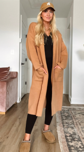 This caramel color is a favorite of mine for the fall. I could live in this coatigan from Mango. (I mean, come on, it’s like a bathrobe you get to leave the house in.) My Dodgers baseball cap is the perfect way to finish this casual look.