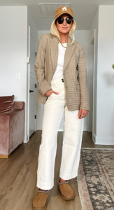 I absolutely love a baseball cap + blazer combo. It’s a little unexpected, and it totally works. I paired my UGG Tasman slippers with cream trousers, my current favorite boxy tee and a neutral blazer here. Topped it off with my Dodgers cap.