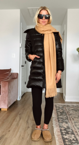 An all-black look broken up with pops of camel. This is the ultimate cozy, but still pulled together outfit. This black puffer jacket pairs so well with Spanx leggings, UGGs and my new favorite scarf.